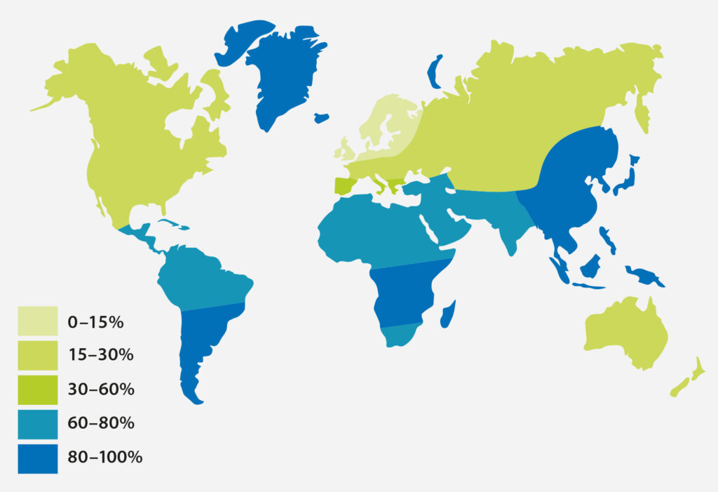 In Ostasien liegt die Rate bei über 90 %, in Teilen Afrikas ist sie ebenfalls sehr hoch, je nach Region zwischen 70–90 %.