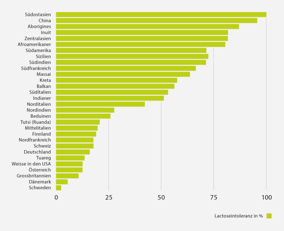 Etwa 75 % der Weltbevölkerung können Milch im Erwachsenenalter nicht verdauen, eine Anpassung, die genetisch bedingt ist und regional stark variiert. Während in Nordeuropa fast alle Menschen Milch vertragen, ist das in Asien oder Afrika die Ausnahme.
